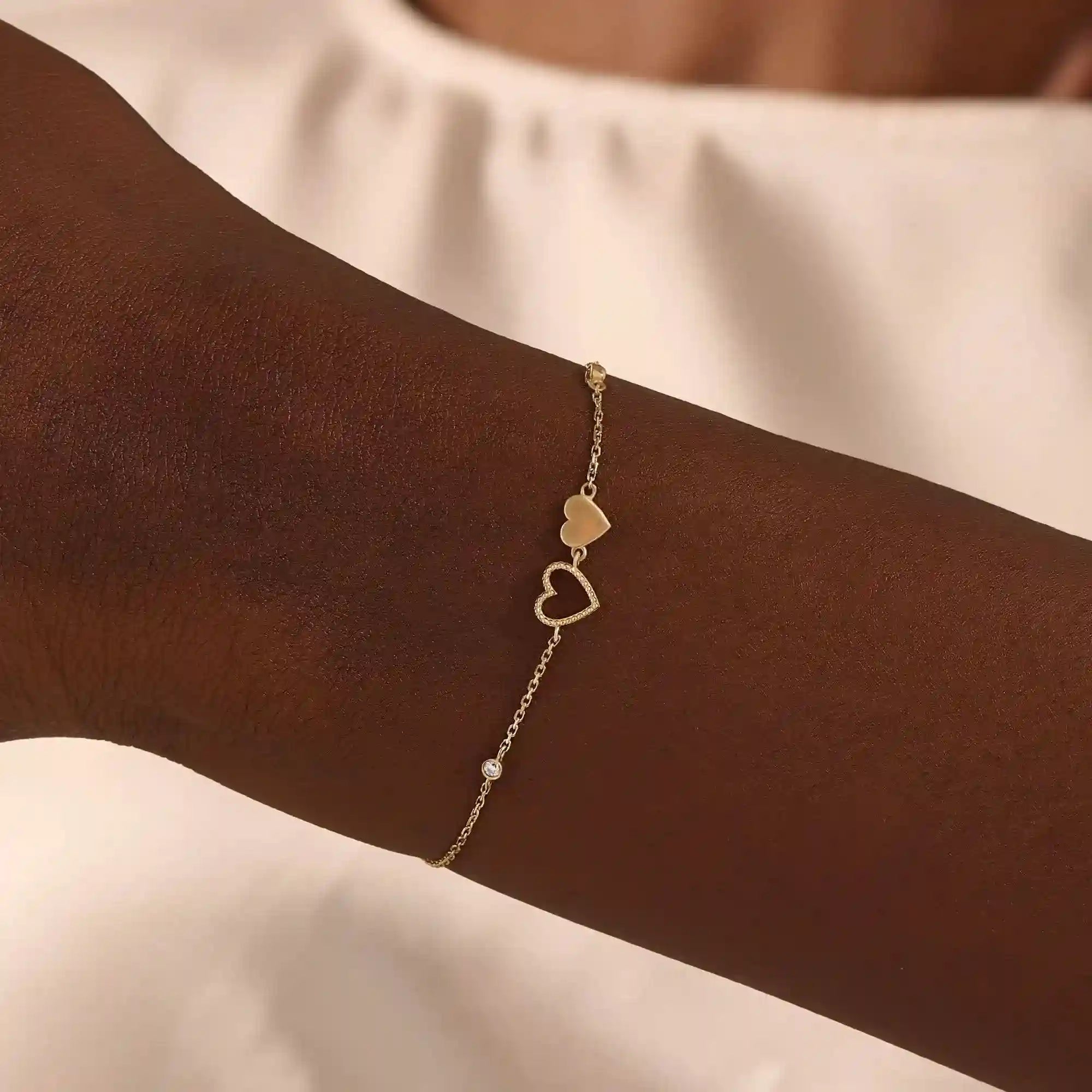 Bu bileklik, iki farklı kalp figürünün sade ama etkileyici uyumuyla tasarlanmıştır. İnce altın zincir üzerinde konumlanan kalpler, bilekte hafif ve zarif bir duruş sergiler. Minimal formu sayesinde günlük kombinlere kolayca uyum sağlar ve gün boyu konforlu bir kullanım sunar. Tek başına kullanıldığında romantik bir vurgu yaratırken, diğer bilekliklerle birlikte modern bir stil oluşturur. Abartıdan uzak ama detaylarıyla fark edilen bir tasarım arayanlar için ideal bir parçadır. Zamansız yapısıyla her yaşta ve her stile eşlik edebilecek özel bir aksesuardır.