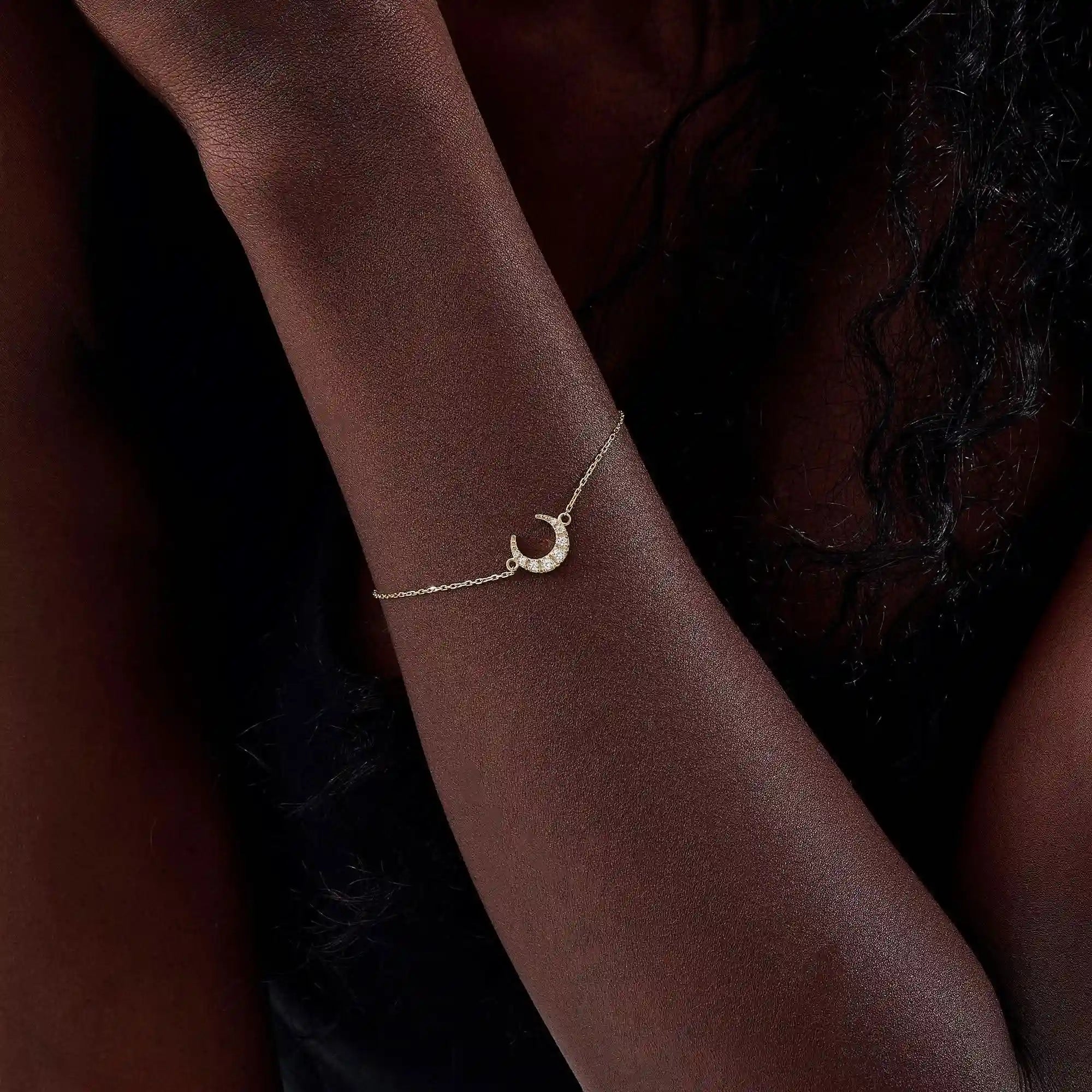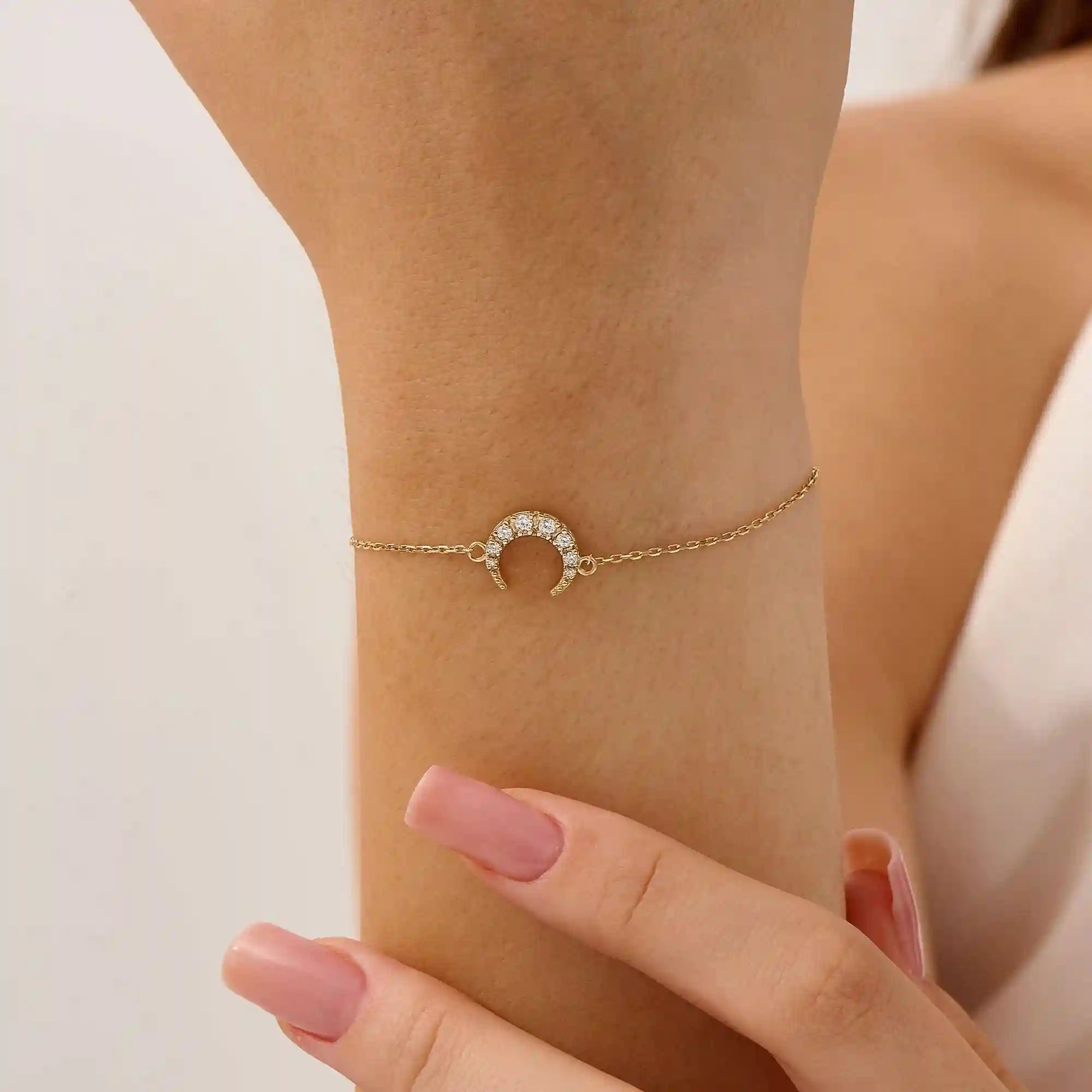 Bu bileklik, ay figürünün sade ama güçlü formunu zarif bir pırlanta ışıltısıyla buluşturur. Yarım ay şeklindeki tasarım, laboratuvar pırlantalarla çevrelenerek bilekte dengeli ve göz yormayan bir parıltı yaratır. İnce altın zinciri sayesinde hafif bir his sunar ve gün boyu rahatça kullanılabilir. Günlük kombinlere uyum sağlayan bu tasarım, tek başına kullanıldığında zarif bir etki yaratırken farklı bilekliklerle birlikte modern bir görünüm sunar. Abartıdan uzak ama detaylarıyla fark edilen bir stil arayanlar için idealdir. Zamansız formu sayesinde her dönemde keyifle kullanılabilecek bir parçadır.