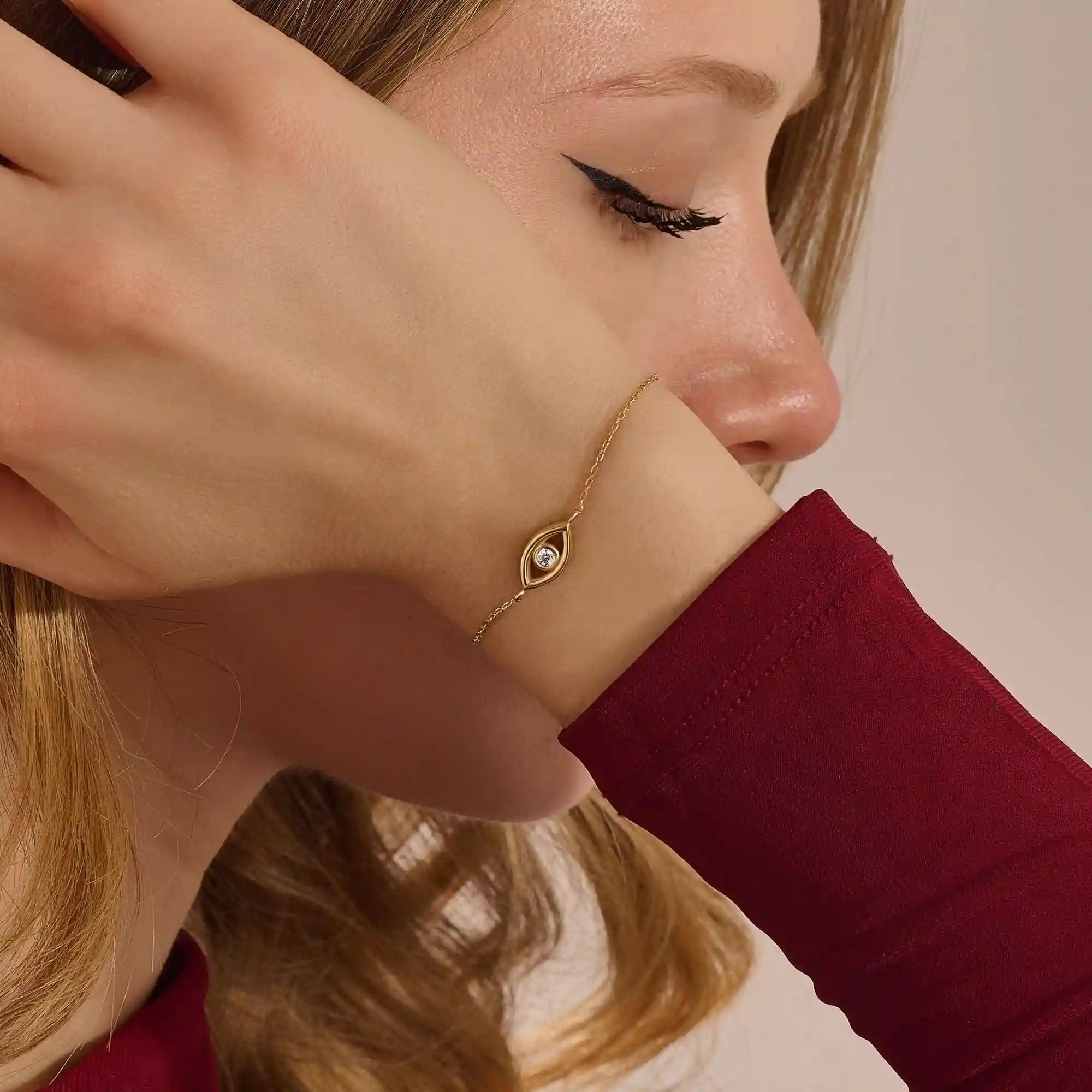 Nazar gözü, yüzyıllardır koruyucu bir sembol olarak kabul edilirken bu tasarımda çağdaş bir yorumla yeniden hayat bulur. Altının sıcak tonu, merkezde yer alan pırlanta detayla dengelenerek modern bir estetik oluşturur. İnce zincir yapısı sayesinde bilekte hafif bir his bırakır ve gün boyu rahatlık sağlar. Günlük kombinlerden özel anlara kadar geniş bir kullanım alanı sunan bu bileklik, tarzınıza sade bir güç katar. Gösterişten uzak ama anlamı güçlü takıları sevenler için tasarlanmıştır. Kendiniz için zamansız bir parça ya da sevdiklerinize düşünülmüş bir hediye alternatifi olarak öne çıkar.
