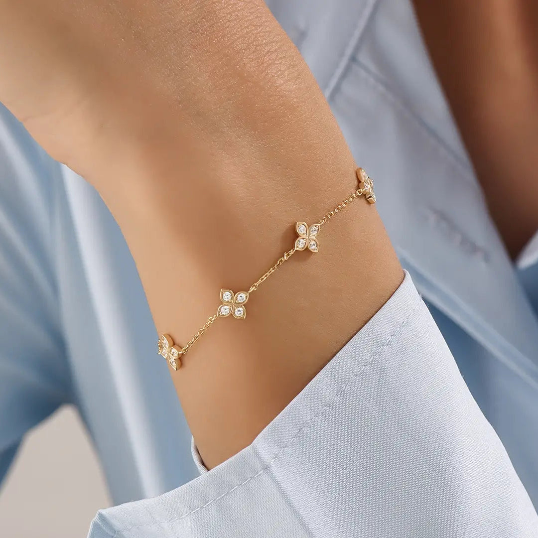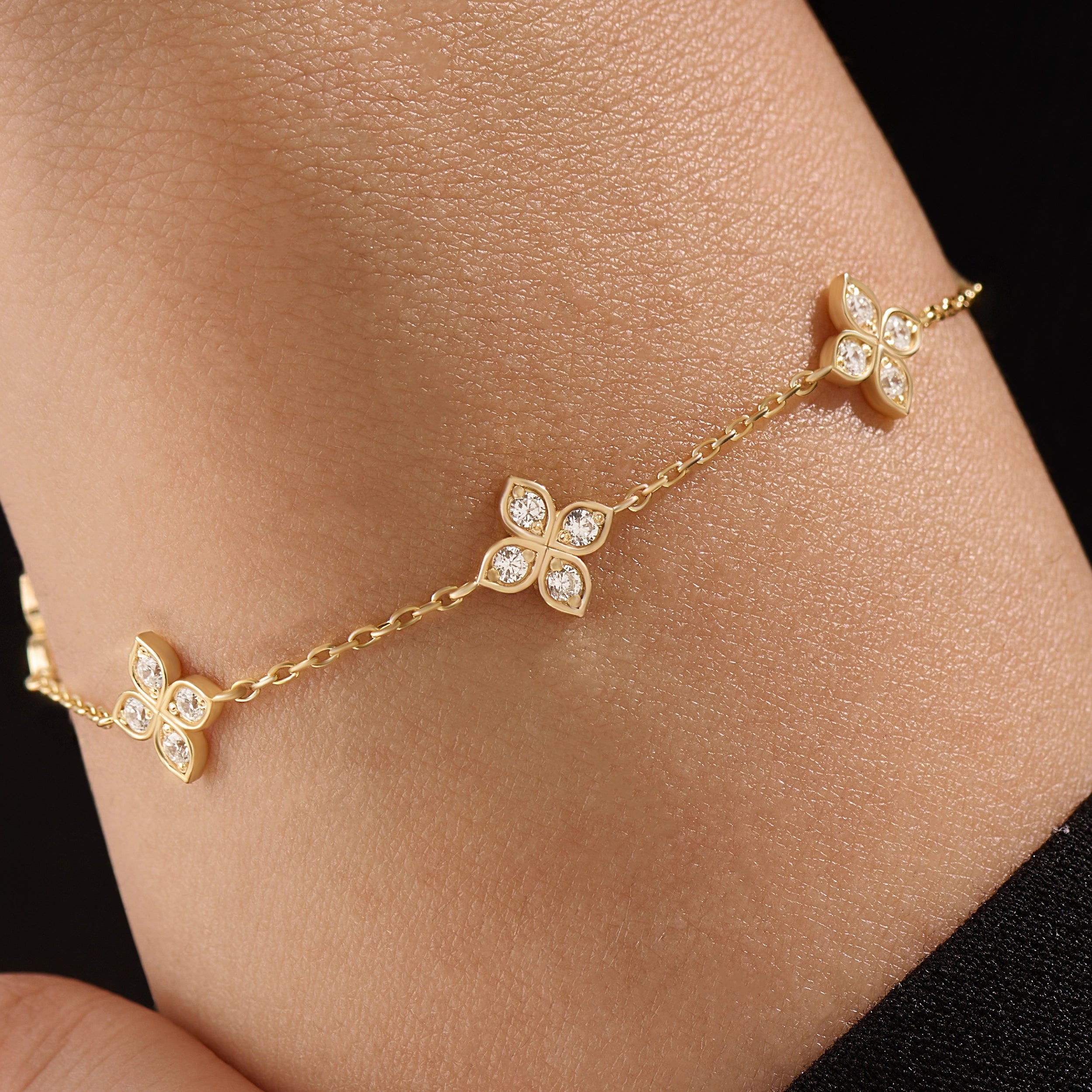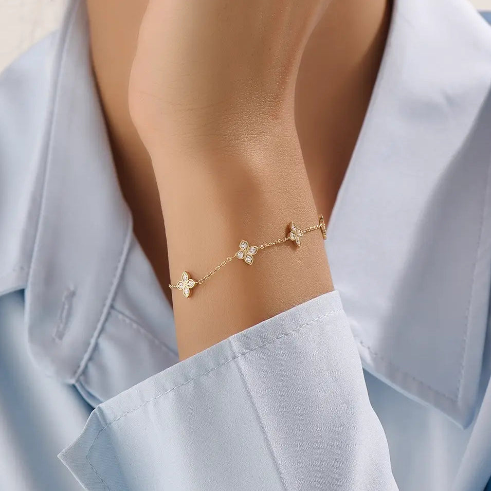 Zincir boyunca tekrarlanan yonca motifleri, bu bilekliğe düzenli ve dengeli bir ritim kazandırır. Taş yerleşimi, ışığı farklı açılardan yakalayarak bilekte yumuşak bir ışıltı oluşturur. Sterling silver üzerine 14 ayar altın vermeil yapısı, parçaya temiz ve aydınlık bir görünüm verir. Ayarlanabilir zinciri sayesinde bileğe kolayca uyum sağlar. Tek başına kullanıldığında zarif bir odak noktası olur. Günlük kullanım için hem pratik hem de detaylı bir seçenektir.